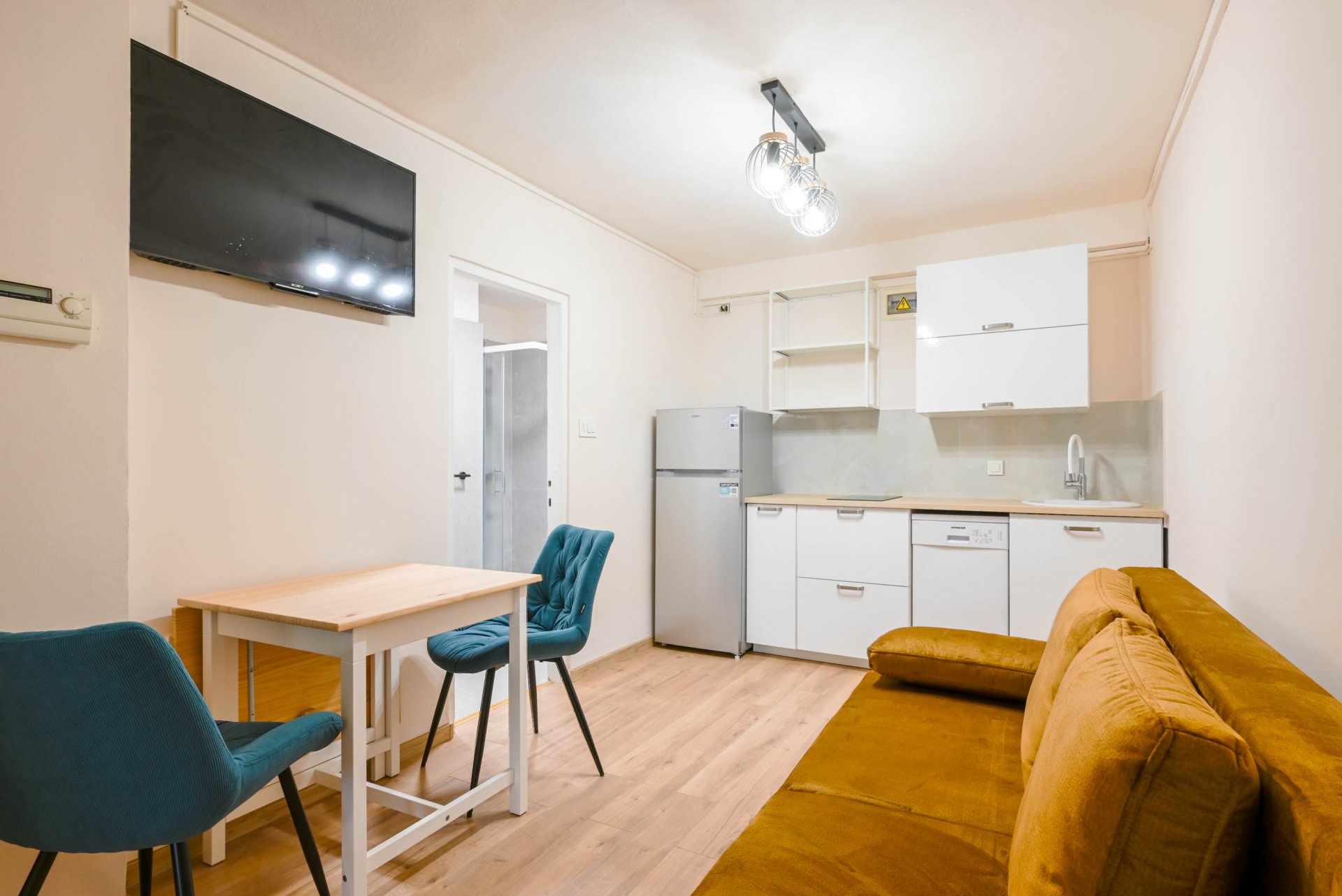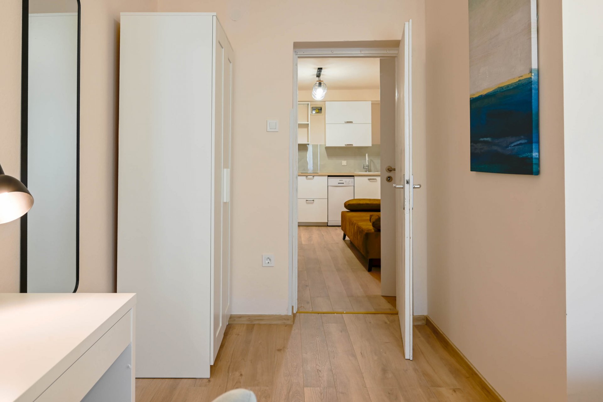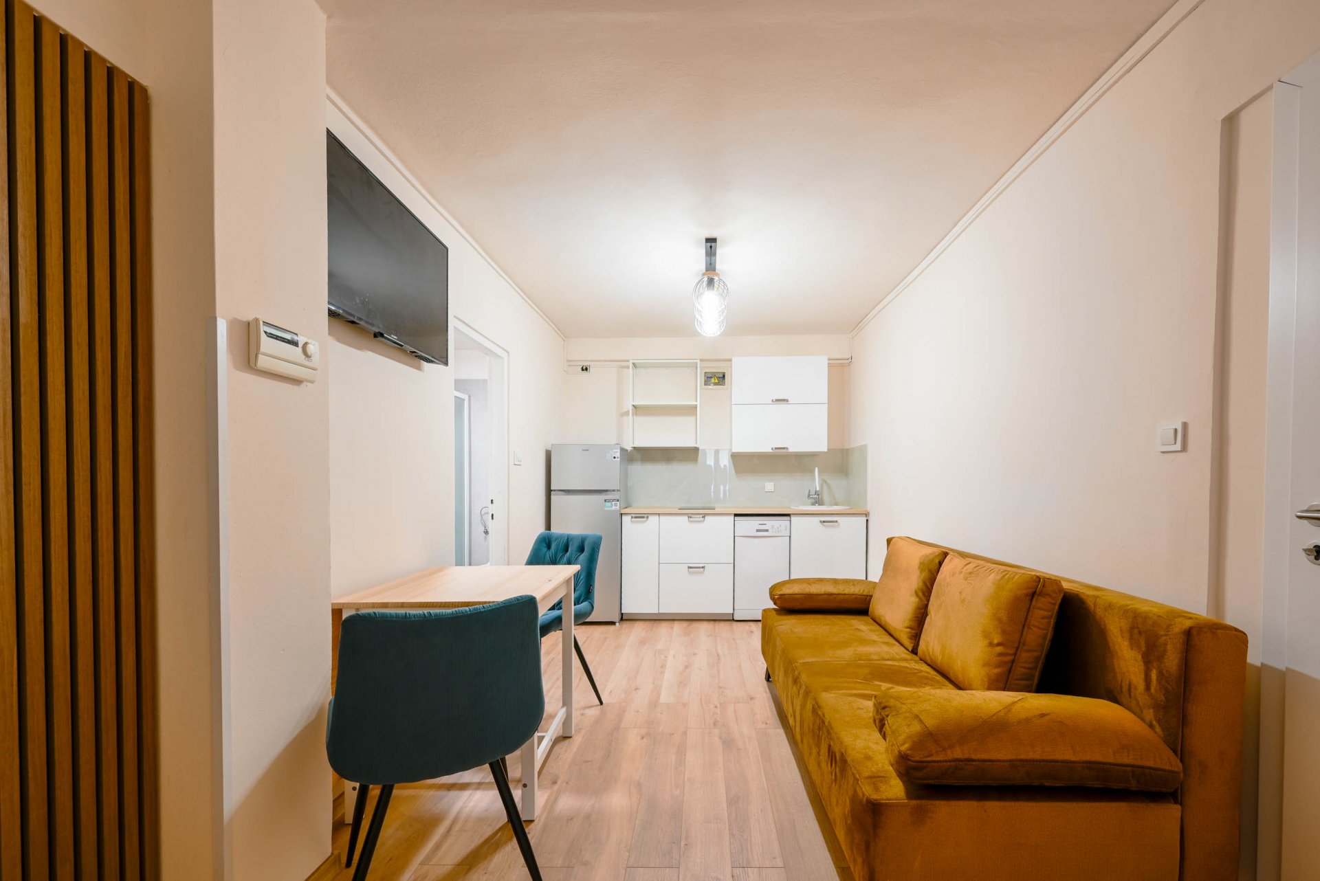 Apartment have one separate bedrooms with double bed and air condition, with laptop friendly desk and smart TV. Free wifi is available. In kitchen there is table with chairs and sofa that can be used for third person. Kitchen have fridge, dishwasher and all necessary to prepare meals.