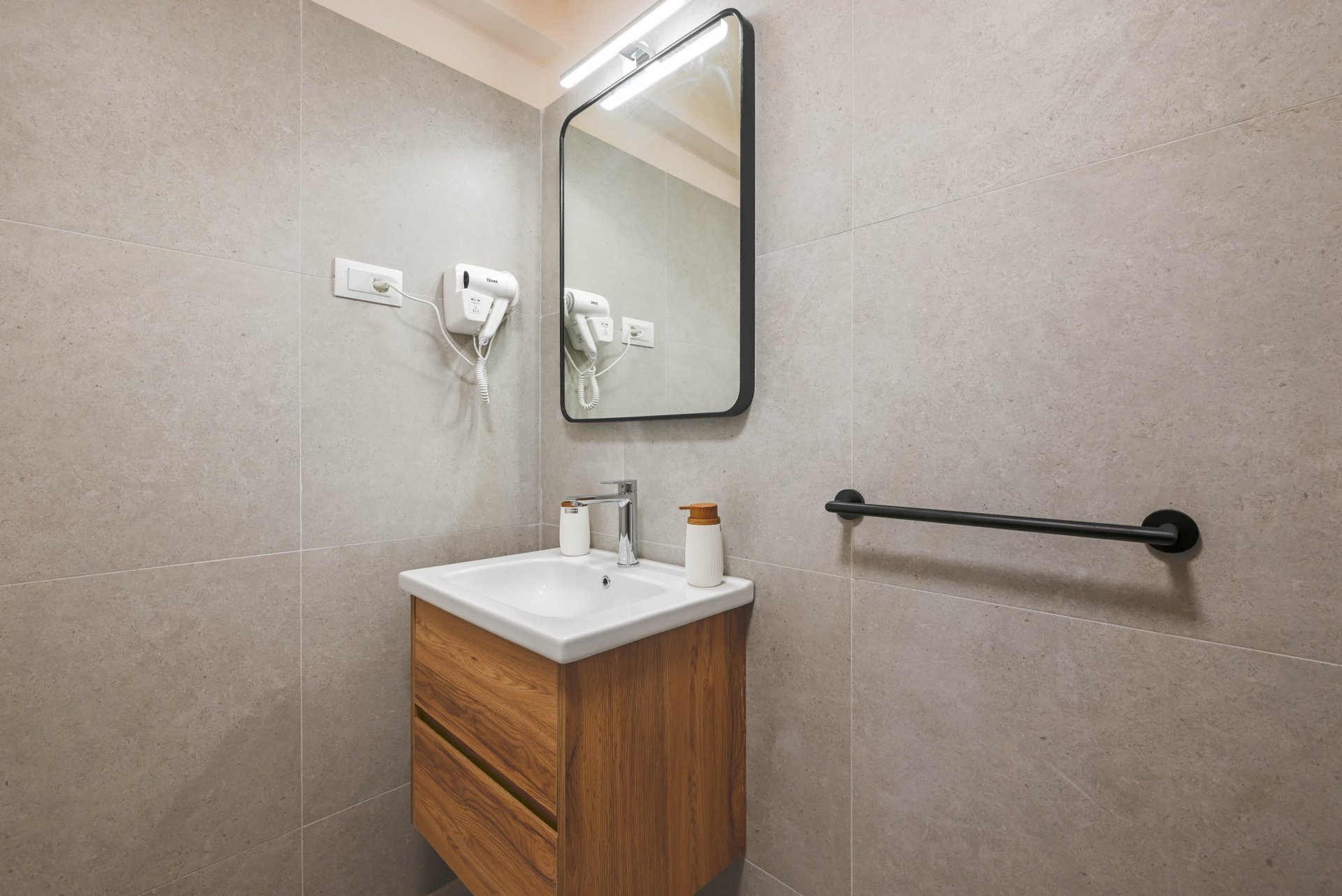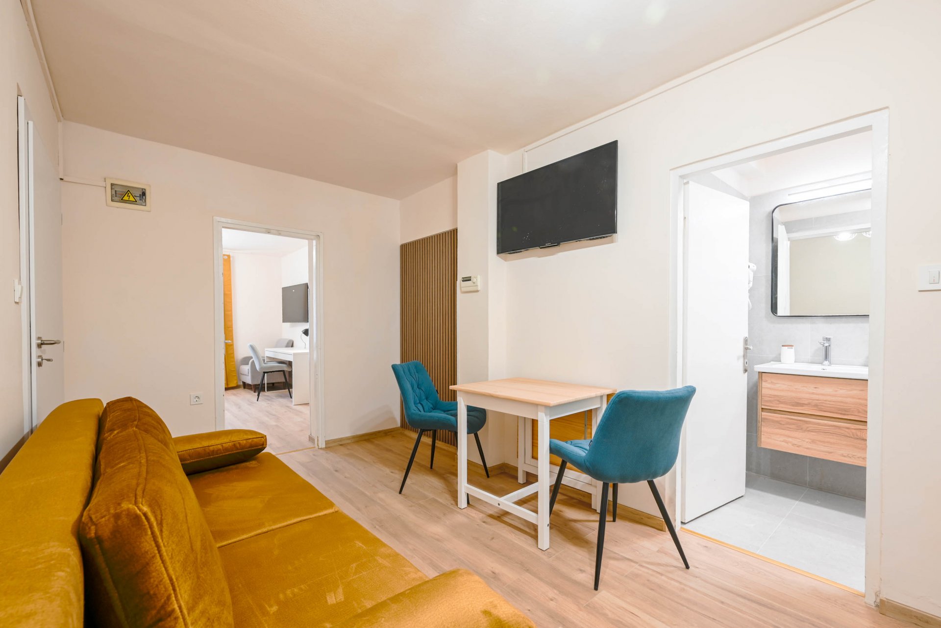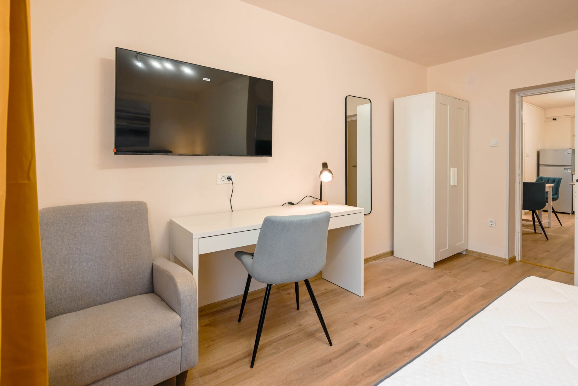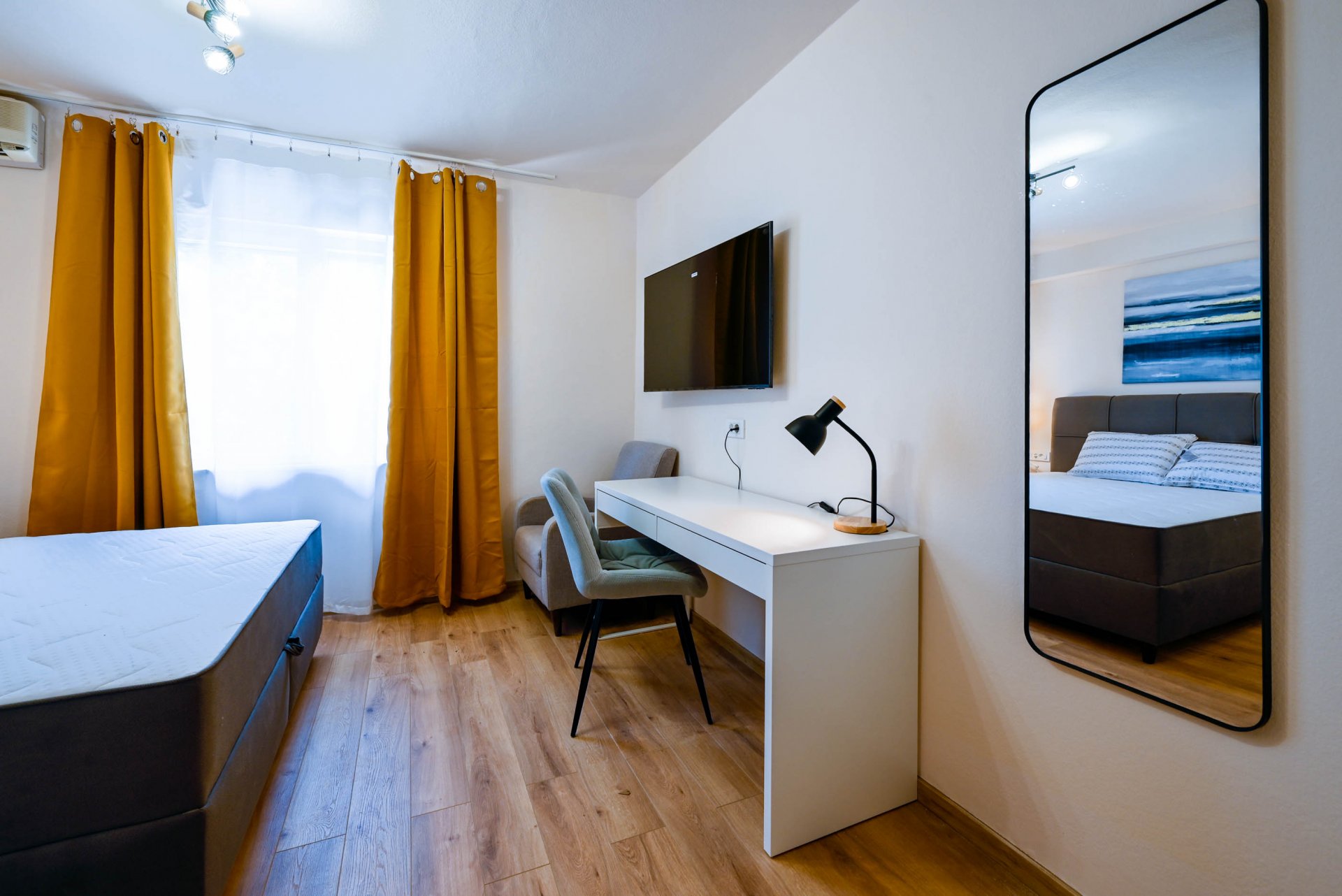 Apartment have one separate bedrooms with double bed and air condition, with laptop friendly desk and smart TV. Free wifi is available. In kitchen there is table with chairs and sofa that can be used for third person. Kitchen have fridge, dishwasher and all necessary to prepare meals.